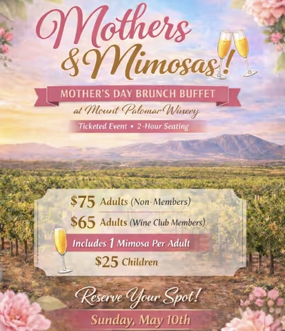Celebrate the wonderful mothers in your life with a stunning vineyard brunch at the Winery. Enjoy a beautiful buffet spread with the rolling vines as your backdrop — and raise a glass to her with a complimentary mimosa included with every adult ticket.
